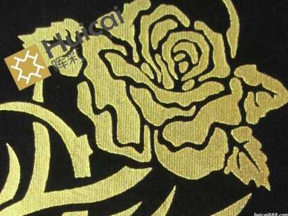 在使用可調(diào)色仿燙金漿過程中,首先,調(diào)色時,用水性色漿根據(jù)設(shè)計花樣的要求直接加入漿料內(nèi)調(diào)顏色;其次,打底時,為了降低生產(chǎn)成本,提高競爭力,建議印花廠在使用中,可根據(jù)承印物的平面情況,先用透明漿打底,然后罩印仿燙金漿。印花工藝完成后,即可有燙金漿燙金印花的效果,而且仿燙銀漿、防燙金漿印花具有的耐水性與耐磨擦性比燙金漿印花優(yōu)越。仿燙銀漿、防燙金印花與燙金印花相比,優(yōu)越之處主要包括五方面: